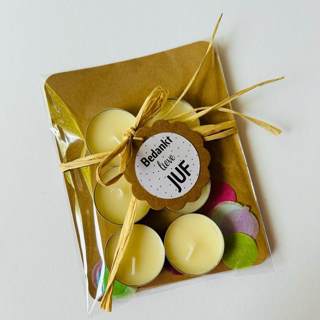 Deze geur waxine lichtjes zijn erg leuk om aan de juf te geven met juffendag of aan het einde van het schooljaar om de juf te bedanken. Leuk verpakt met confetti en je kan zelf een label uitkiezen.