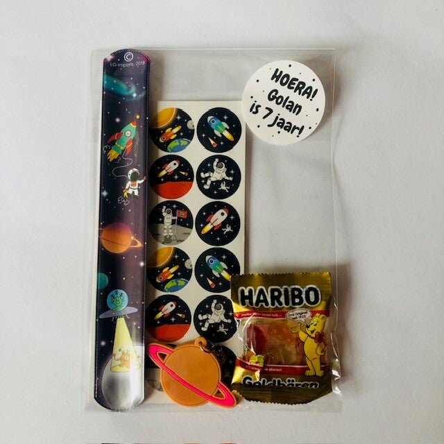 Deze ruimte traktatie is toch een feestje! Een klaparmband in ruimte thema met ruimte sleutelhanger en stickervel. De sleutelhangers worden gemixt geleverd. Je kan zelf kiezen of je nog iets lekkers en een sticker wil toevoegen.