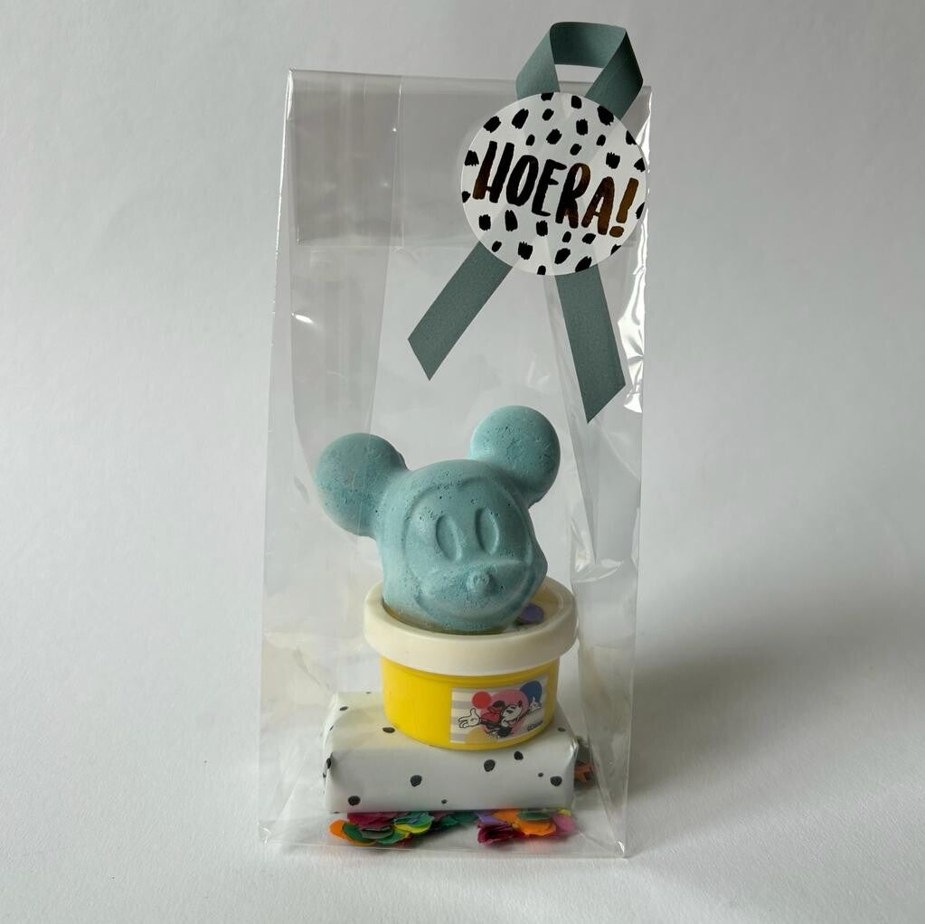 Leuke stoepkrijt traktatie met een mickey mouse figuurtje en een klein potje klei in mickey mouse thema. Deze traktatie is altijd een feest bij de kleintjes!