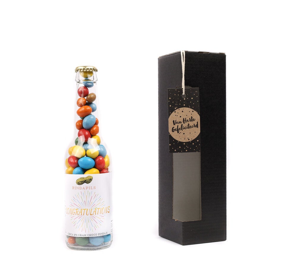Opzoek naar een leuk én lekker cadeau om iemand te feliciteren? Dan ben je hier aan het juiste adres! PindaPils is het ideale cadeau voor felicitaties! Een leuk glazen flesje met overheerlijke knapperige chocolade pinda's en dit alles in een feestelijke verpakking!