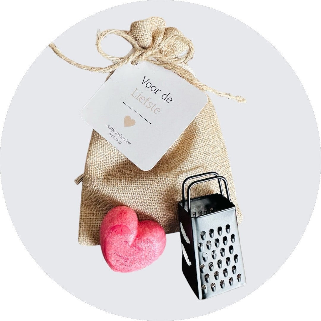 Leuk cadeau zakje gevuld met amber blok hartje & rasp.
